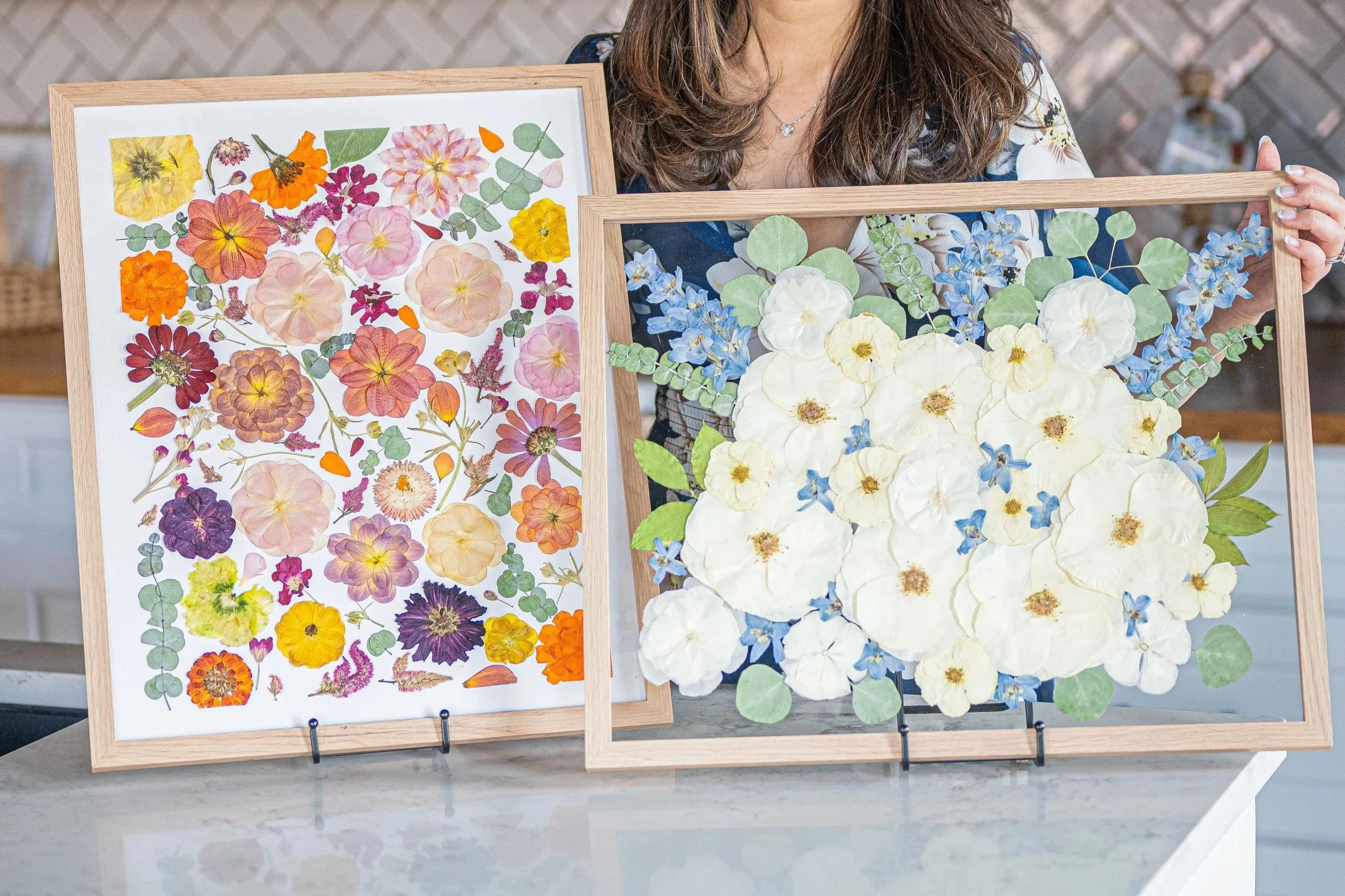 Most flowers can be pressed, but flatter blooms (like roses, peonies, delphinium, hydrangea, baby breath and greenery) produce the best results. For larger flowers, we may disassemble the petals for the most beautiful layout.